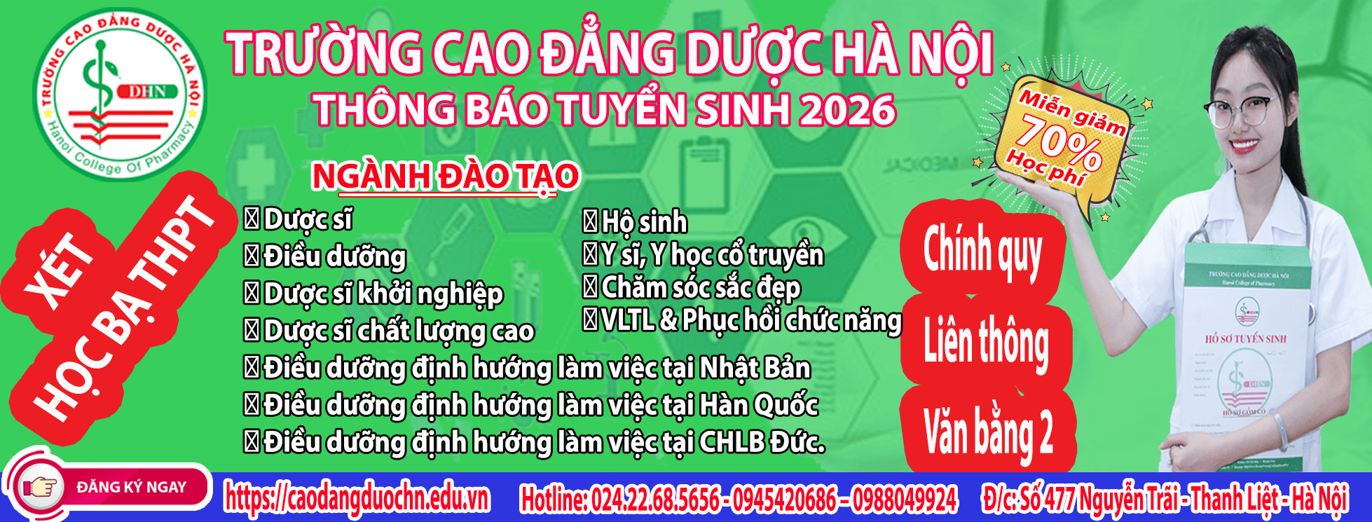 Học khối ngành Y – Dược – Chăm sóc sức khỏe đang là xu hướng bền vững với nhu cầu nhân lực tăng cao trong và ngoài nước. Chọn đúng ngành – đúng trường sẽ mở ra cơ hội nghề nghiệp ổn định, thu nhập tốt và được xã hội trân trọng. Hãy để Trường Cao đẳng Dược Hà Nội đồng hành cùng bạn trên con đường chinh phục ước mơ Blouse Trắng!